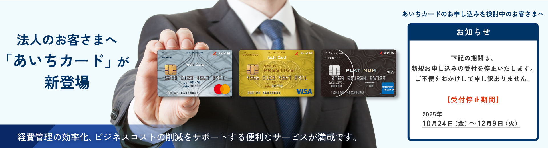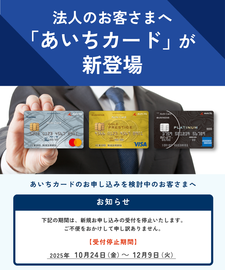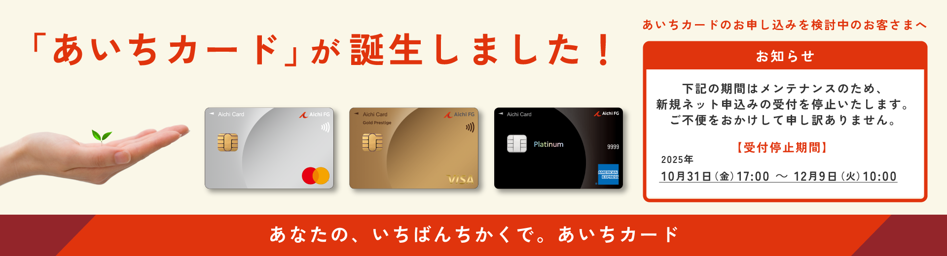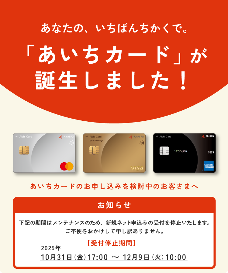 下記の期間はメンテナンスを実施しますので、個人のお客さまはあいちカードのネット申込みをご利用いただけません。ご不便をおかけして申し訳ございませんが、メンテナンス終了後にお申し込みくださいますようお願い申し上げます。